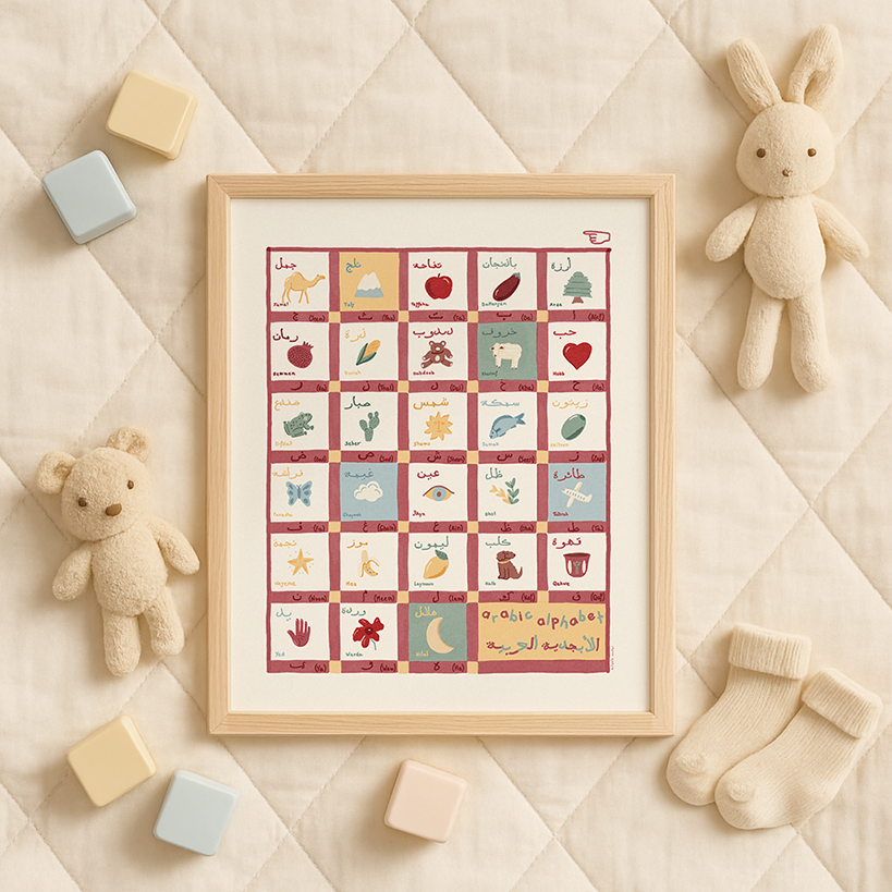 De ma collection Little Habibis. Créée pour les familles de la diaspora libanaise et levantine, Little Habibis apporte une touche d'authenticité et de tradition à la chambre de votre bébé. Des affiches alphabet aux adorables scènes animalières en passant par les souvenirs personnalisables, chaque impression d'art est un cadeau attentionné, porteur d'amour, de culture et de joie.
