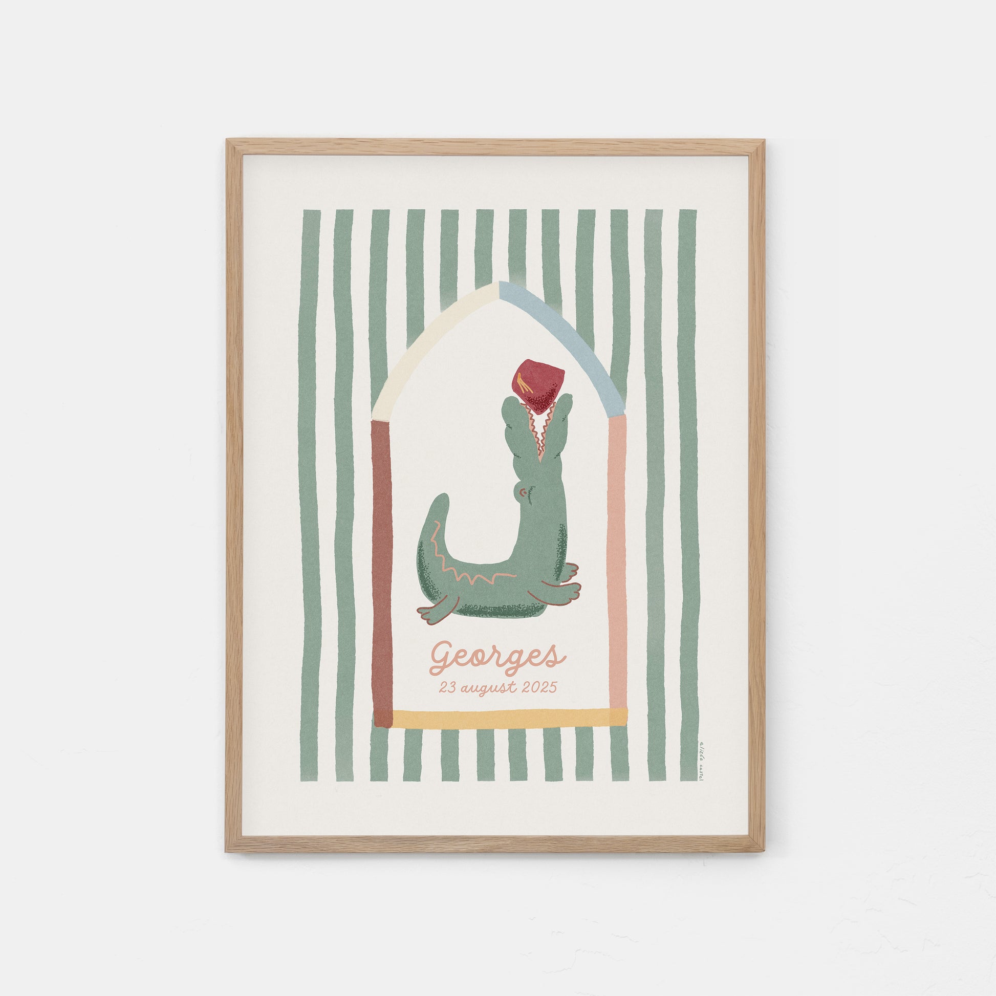 Avec son sourire espiègle et son Tarbouche dans la gueule, ce sympathique crocodile apporte une touche de gaieté à la chambre d'enfant. Personnalisez-le avec son nom et sa date de naissance pour un souvenir qui restera gravé dans leur mémoire.
