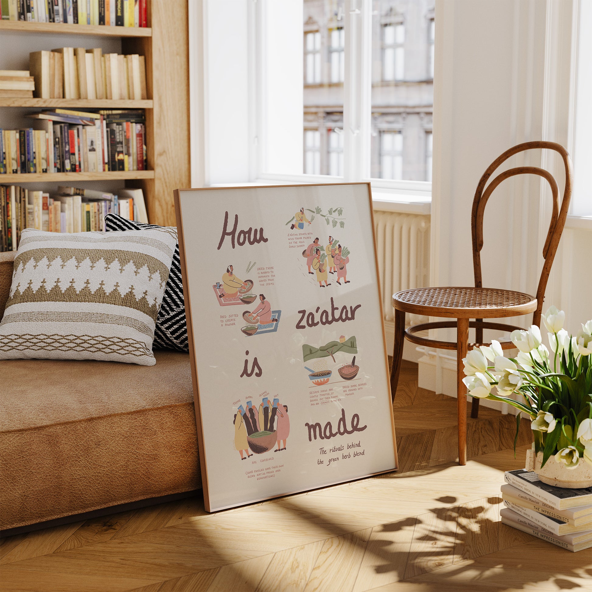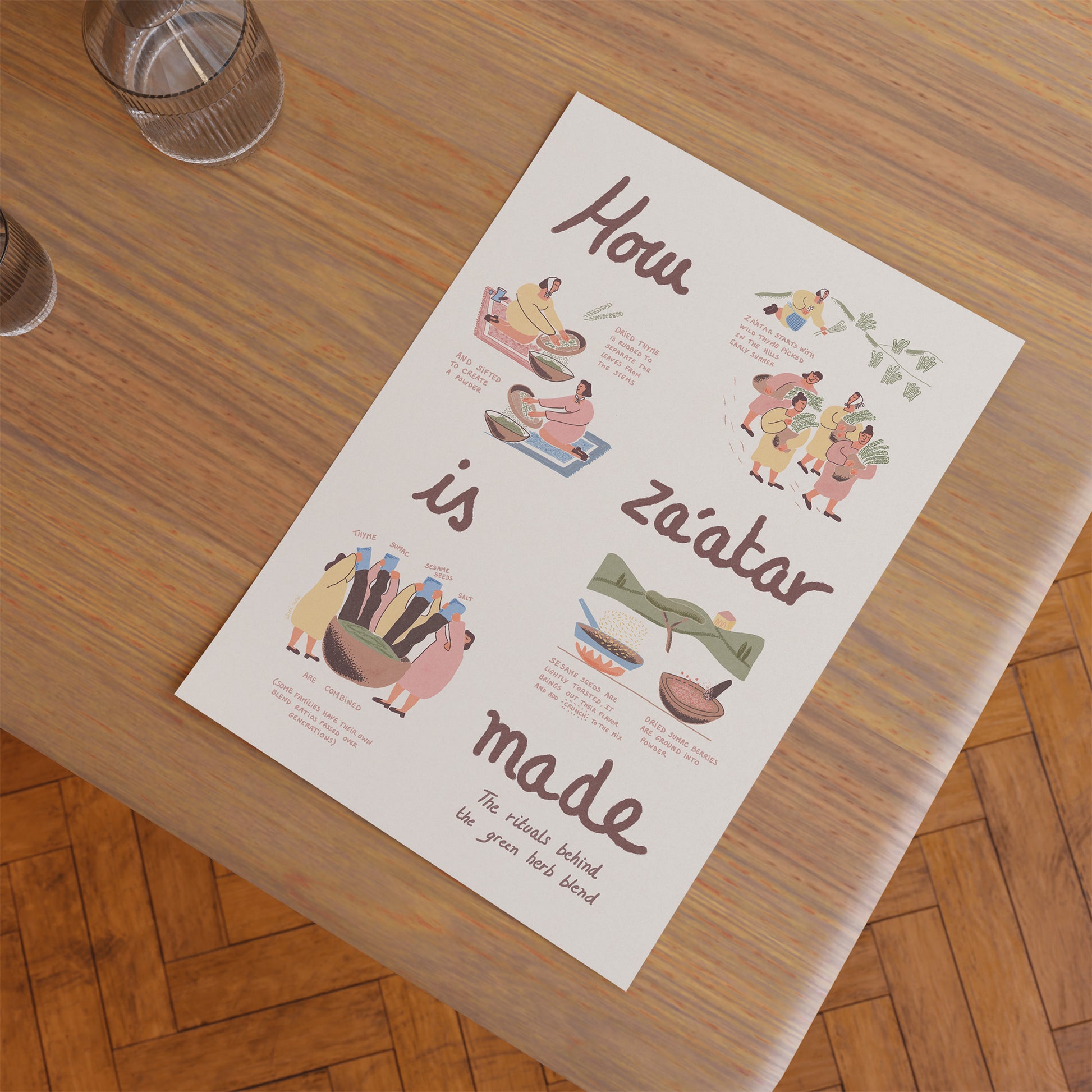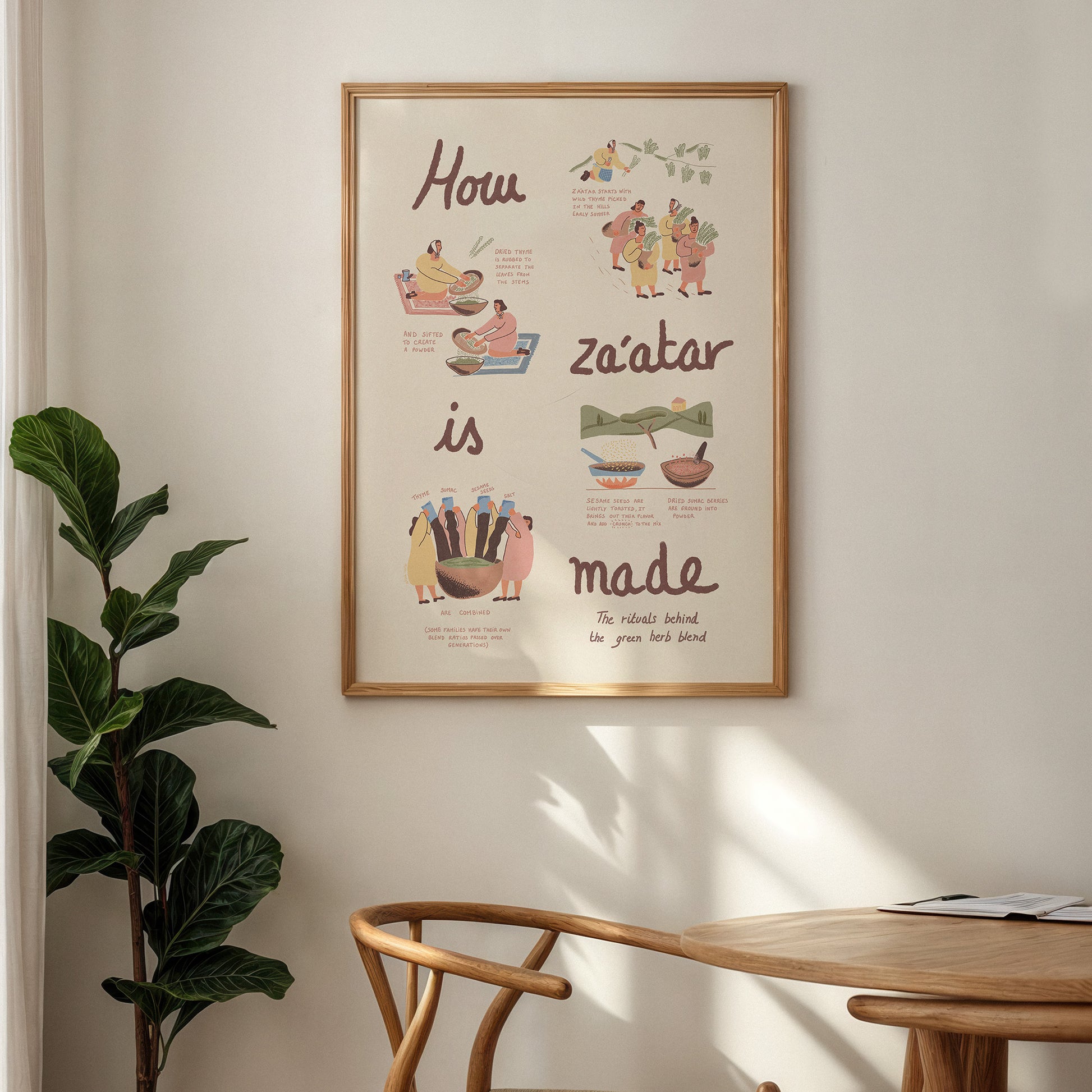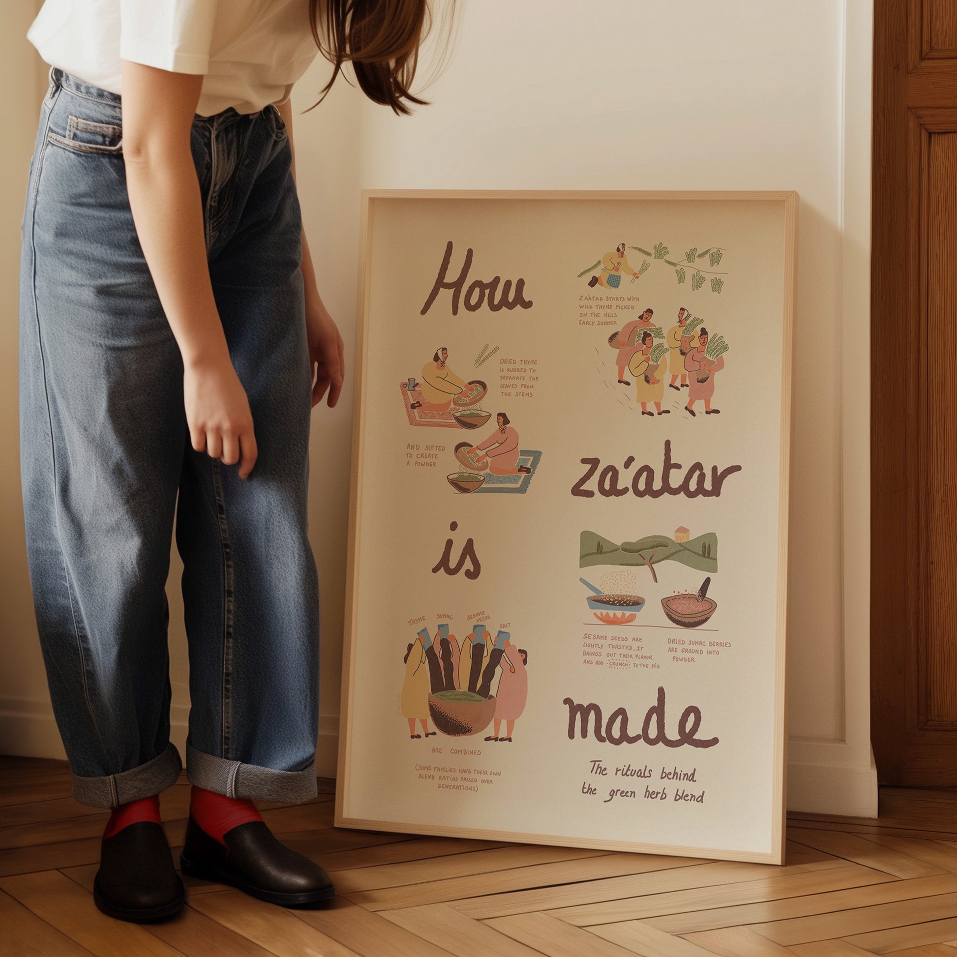 Cette estampe détaille les étapes traditionnelles de la préparation du zaatar – de la cueillette manuelle du thym sauvage dans les collines à la torréfaction des graines de sésame et à la mouture du sumac – dans un format visuel et facile à comprendre. Que vous ayez grandi avec le zaatar ou que vous l'ayez découvert plus tard, cette œuvre est un hommage à la culture, à la mémoire et à la communauté.