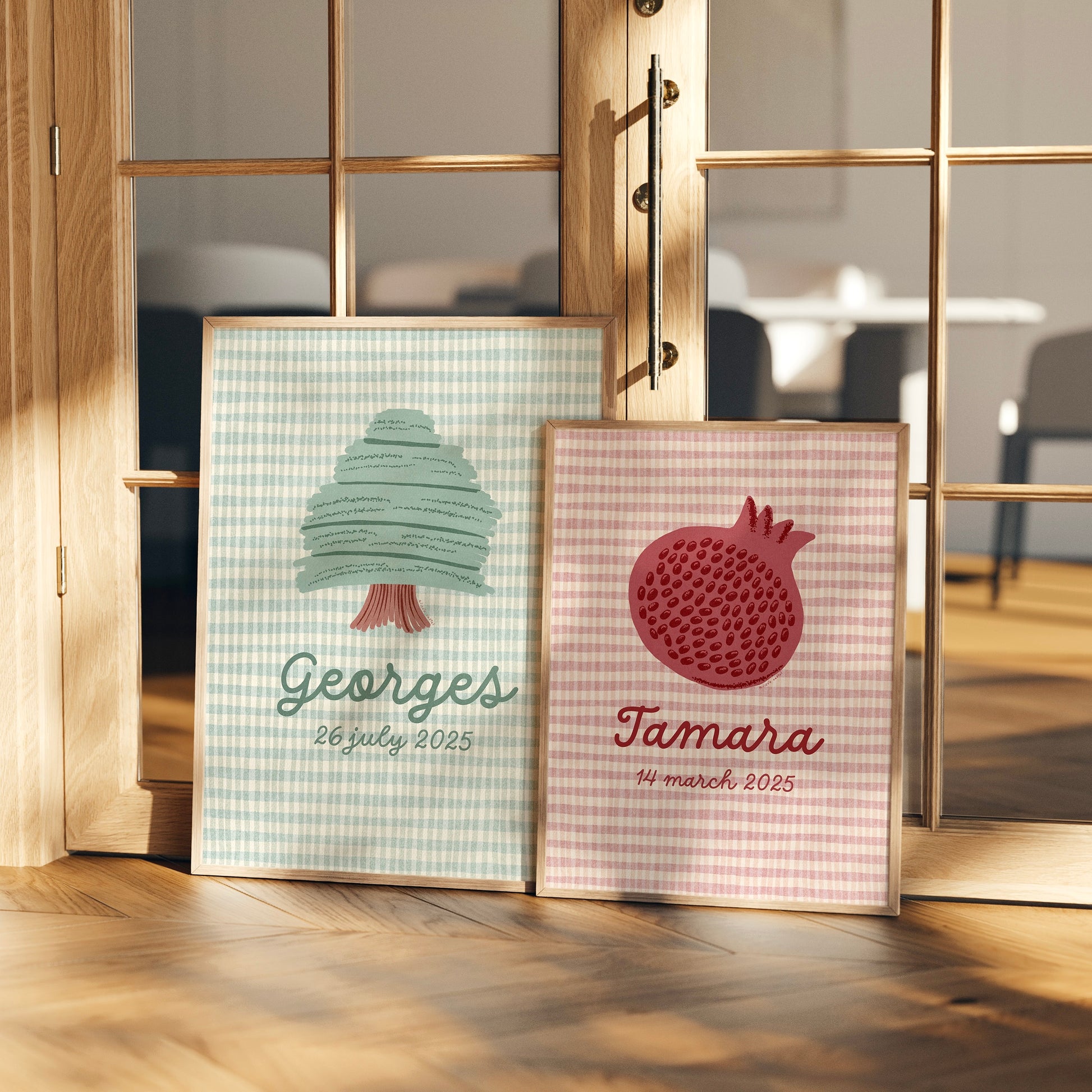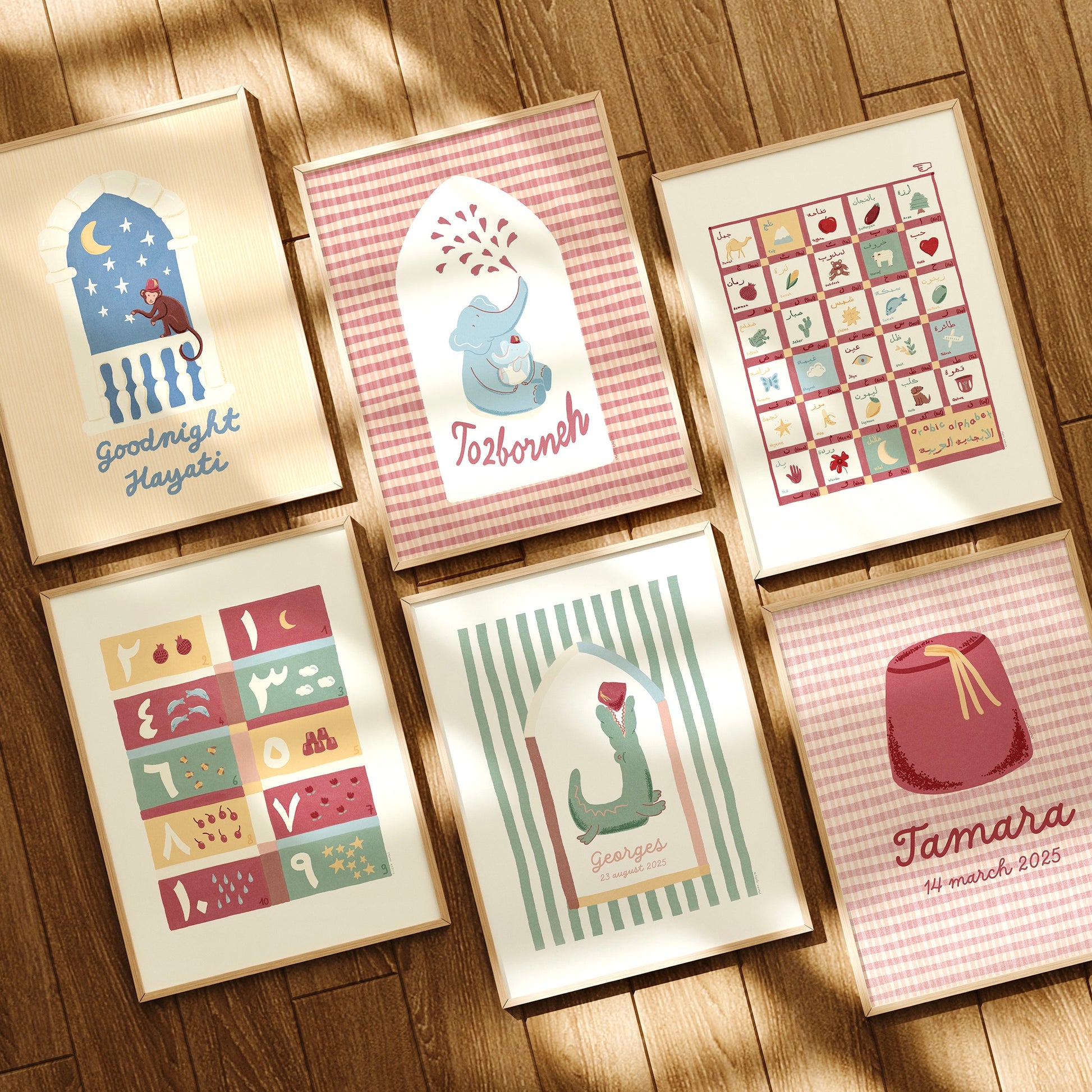 De ma collection Little Habibis. Créée pour les familles de la diaspora libanaise et levantine, Little Habibis apporte une touche d'authenticité et de tradition à la chambre de votre bébé. Des affiches alphabet aux adorables scènes animalières en passant par les souvenirs personnalisables, chaque impression d'art est un cadeau attentionné, porteur d'amour, de culture et de joie.