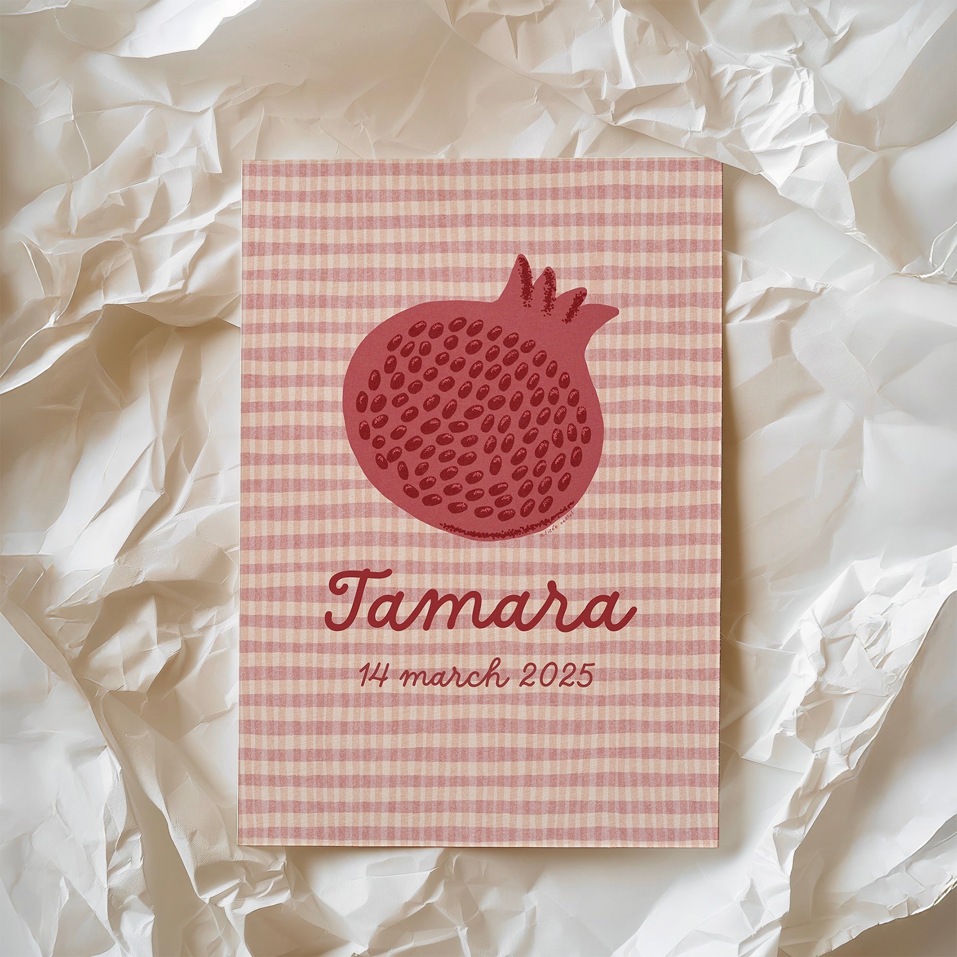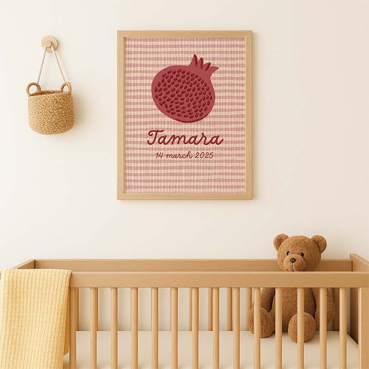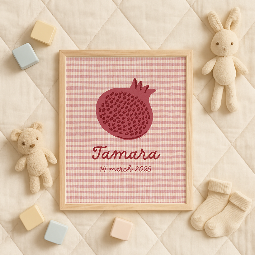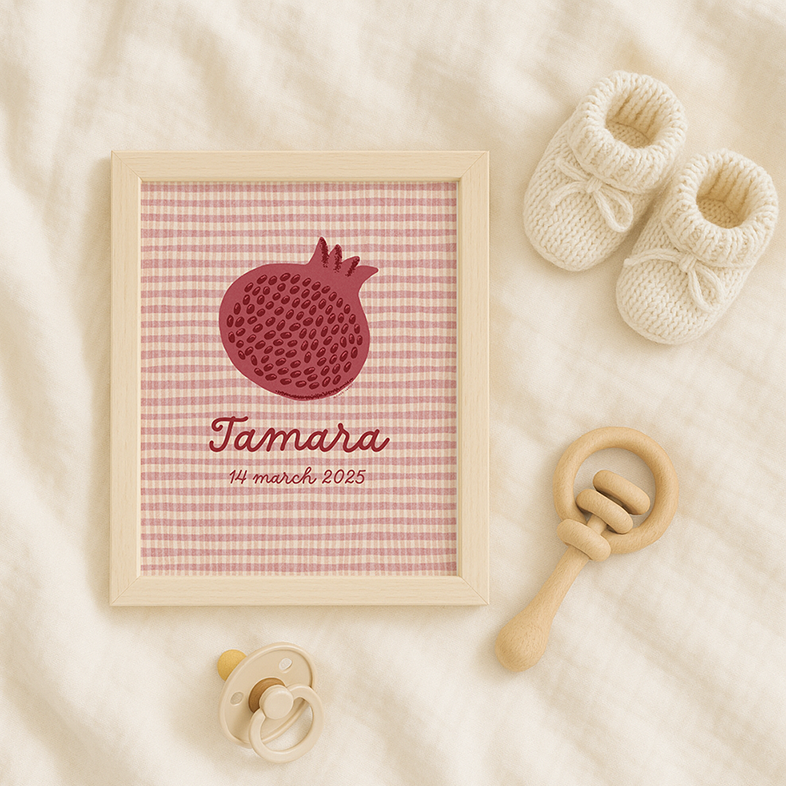 Remmen (Grenade en arabe levantin). Symbole de chance, de vie et de douceur, ce porte-bonheur est un cadeau simple et plein de sens pour un nouveau-né. Personnalisez-le avec son nom et sa date de naissance pour un souvenir qui restera gravé dans sa mémoire.