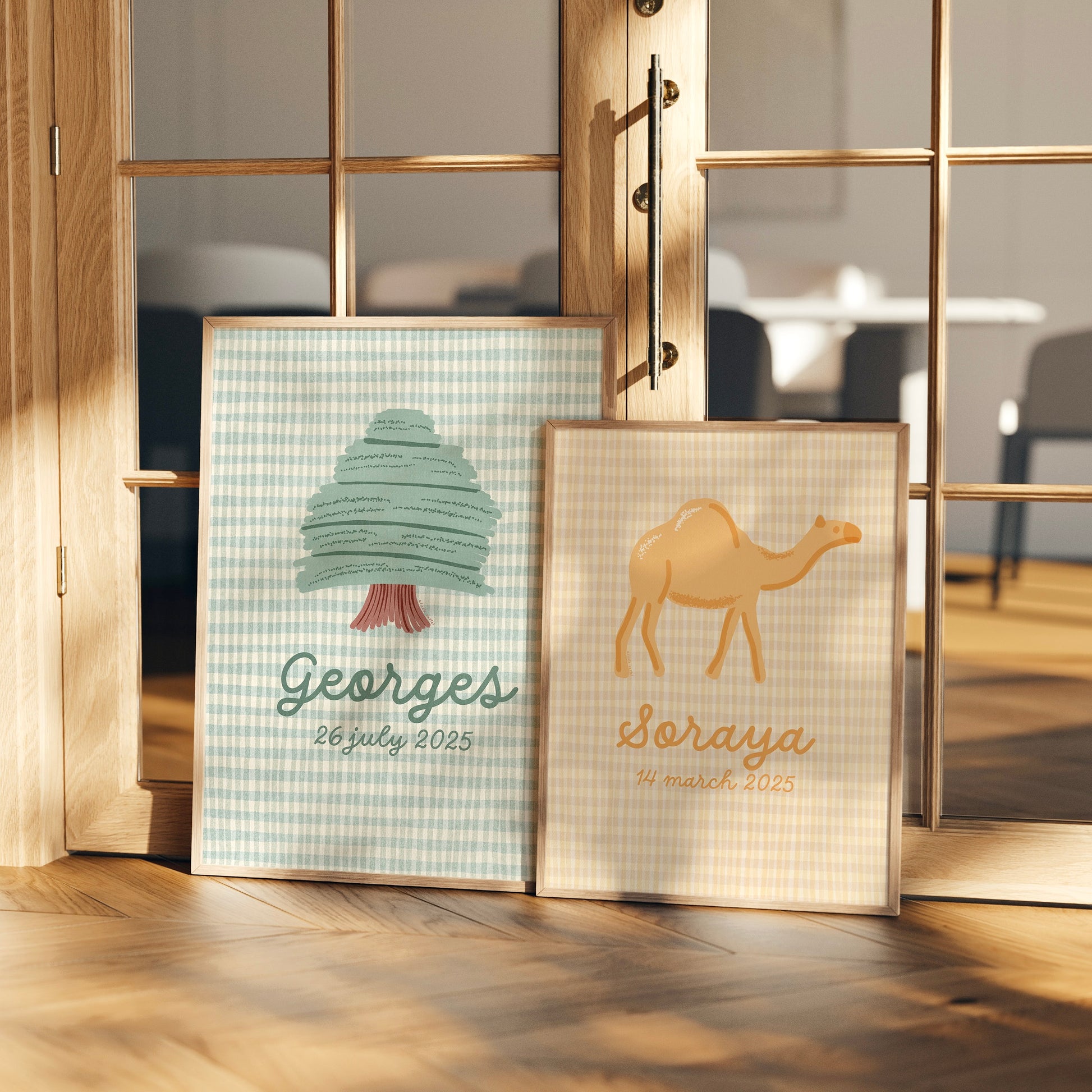 De ma collection Little Habibis. Créée pour les familles de la diaspora libanaise et levantine, Little Habibis apporte une touche d'authenticité et de tradition à la chambre de votre bébé. Des affiches alphabet aux adorables scènes animalières en passant par les souvenirs personnalisables, chaque impression d'art est un cadeau attentionné, porteur d'amour, de culture et de joie.