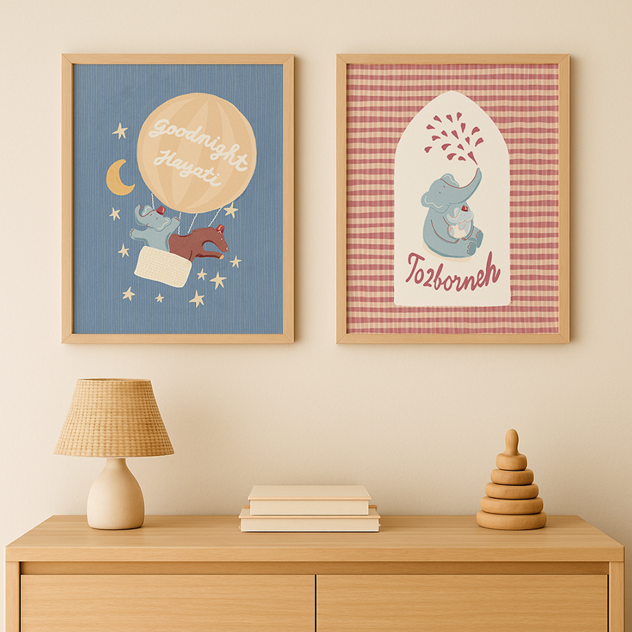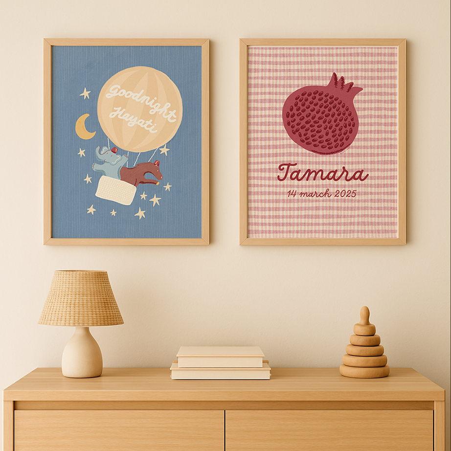 De ma collection Little Habibis. Créée pour les familles de la diaspora libanaise et levantine, Little Habibis apporte une touche d'authenticité et de tradition à la chambre de votre bébé. Des affiches alphabet aux adorables scènes animalières en passant par les souvenirs personnalisables, chaque impression d'art est un cadeau attentionné, porteur d'amour, de culture et de joie.
