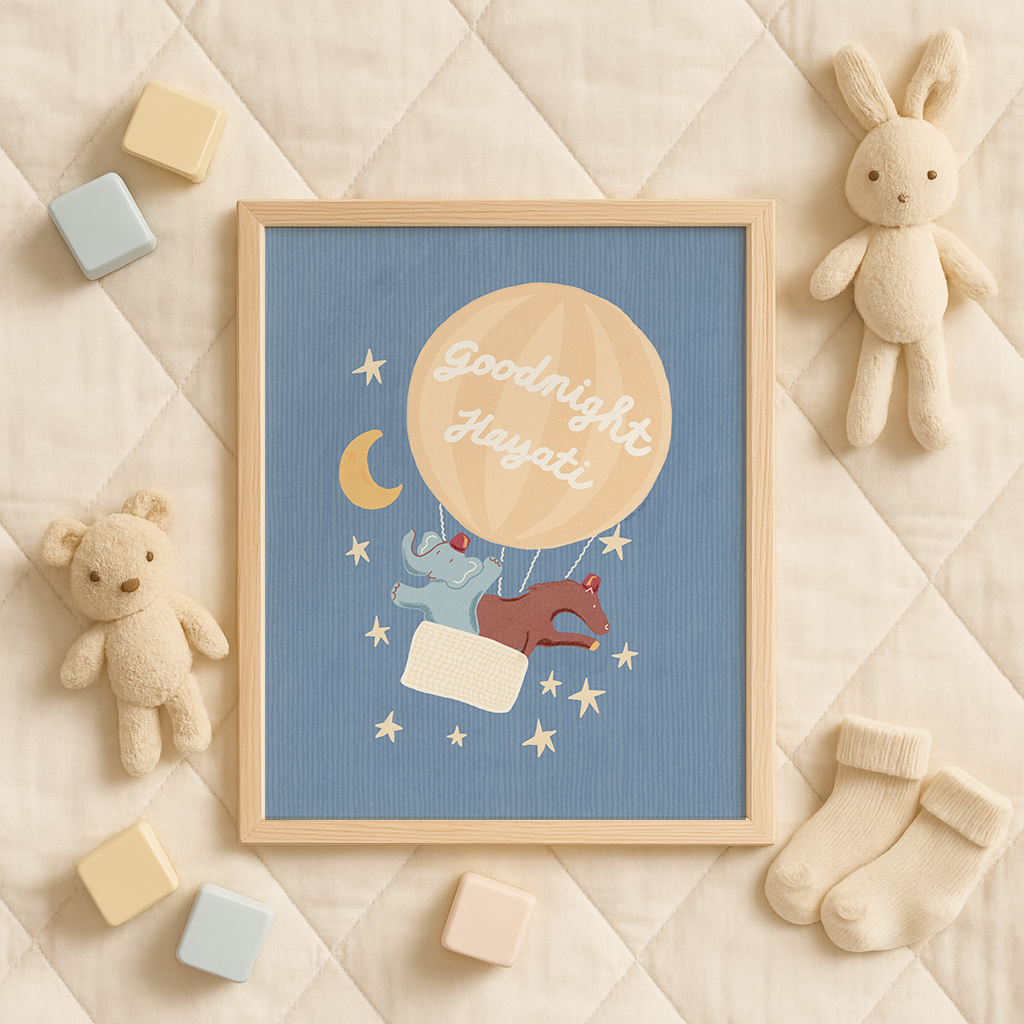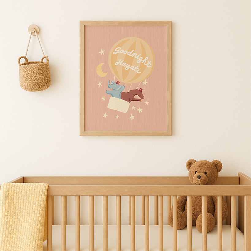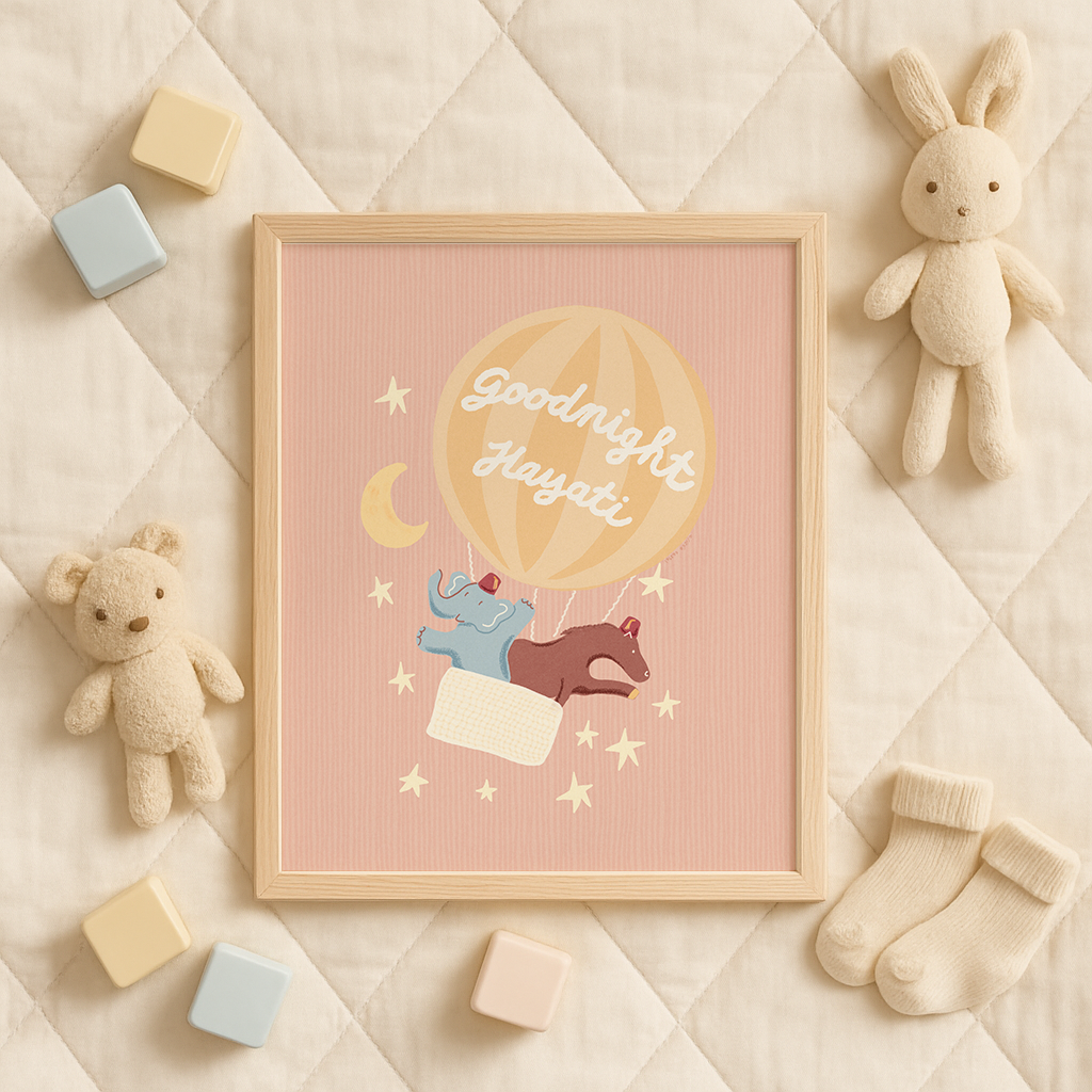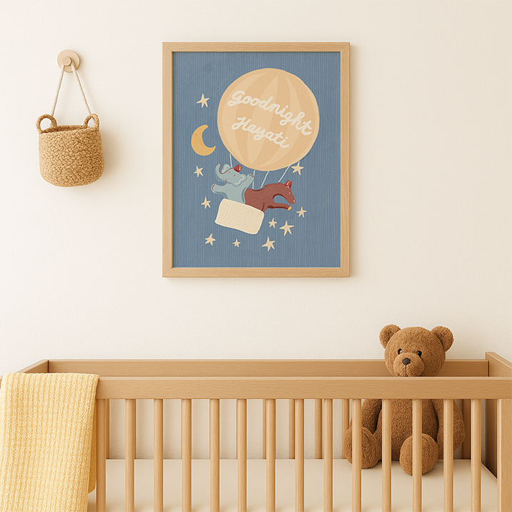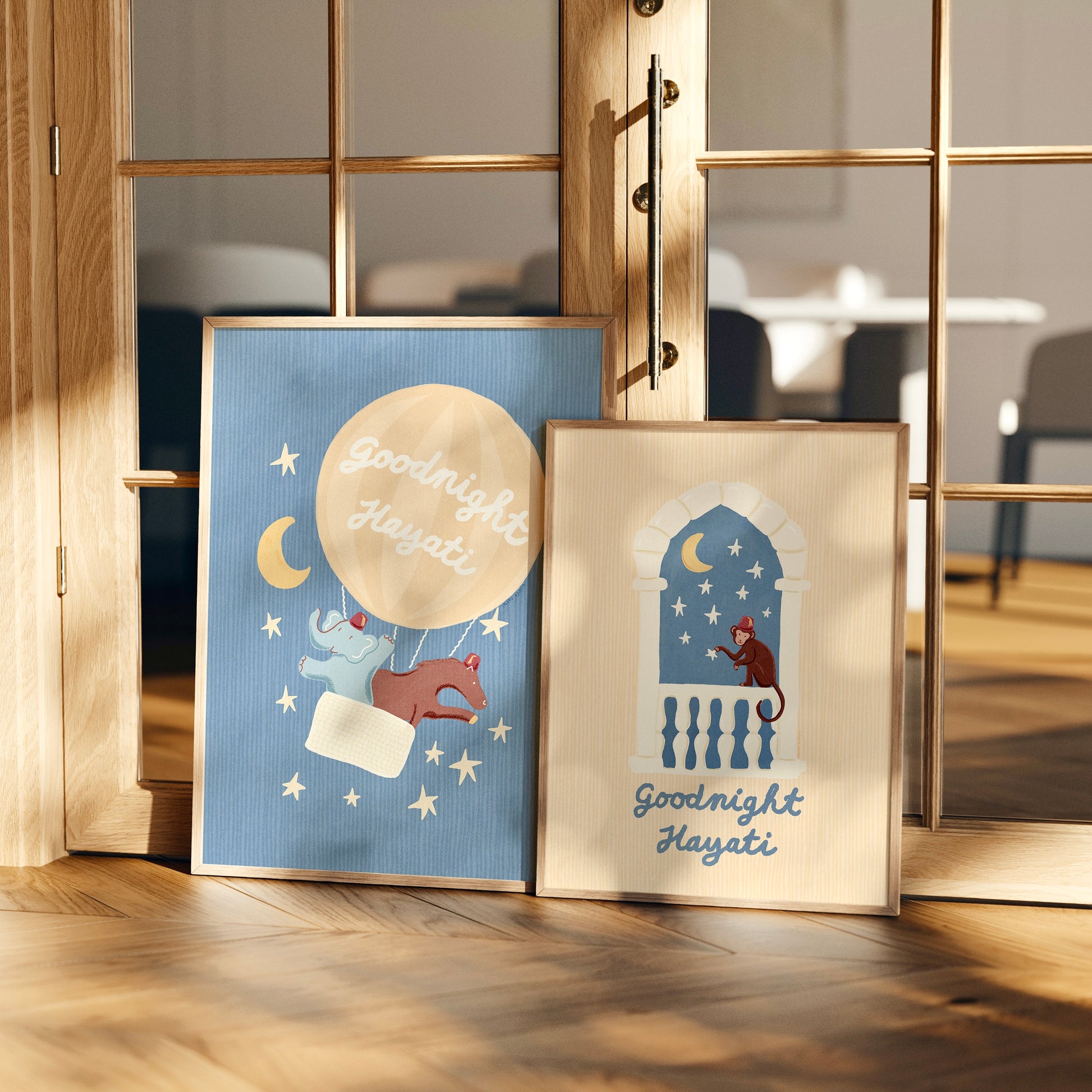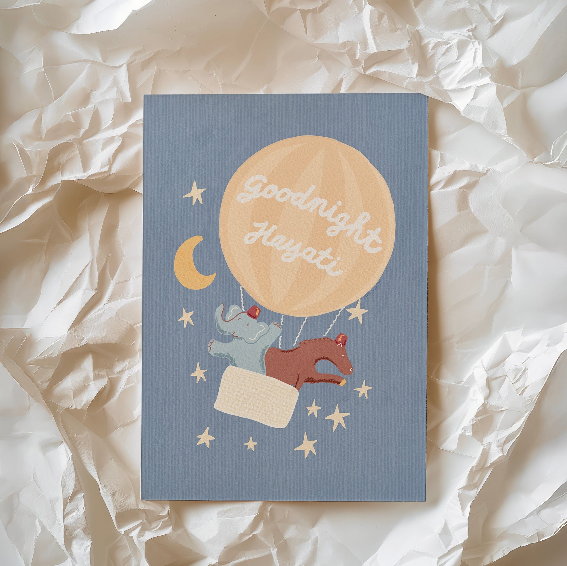 Voyage au clair de lune (Bonne nuit Hayati). Deux amis dérivent vers les étoiles à bord d'une montgolfière. Une impression onirique qui apaise l'heure du coucher. Un joli cadeau pour une baby shower ou une jolie décoration murale pour la chambre d'un tout petit.