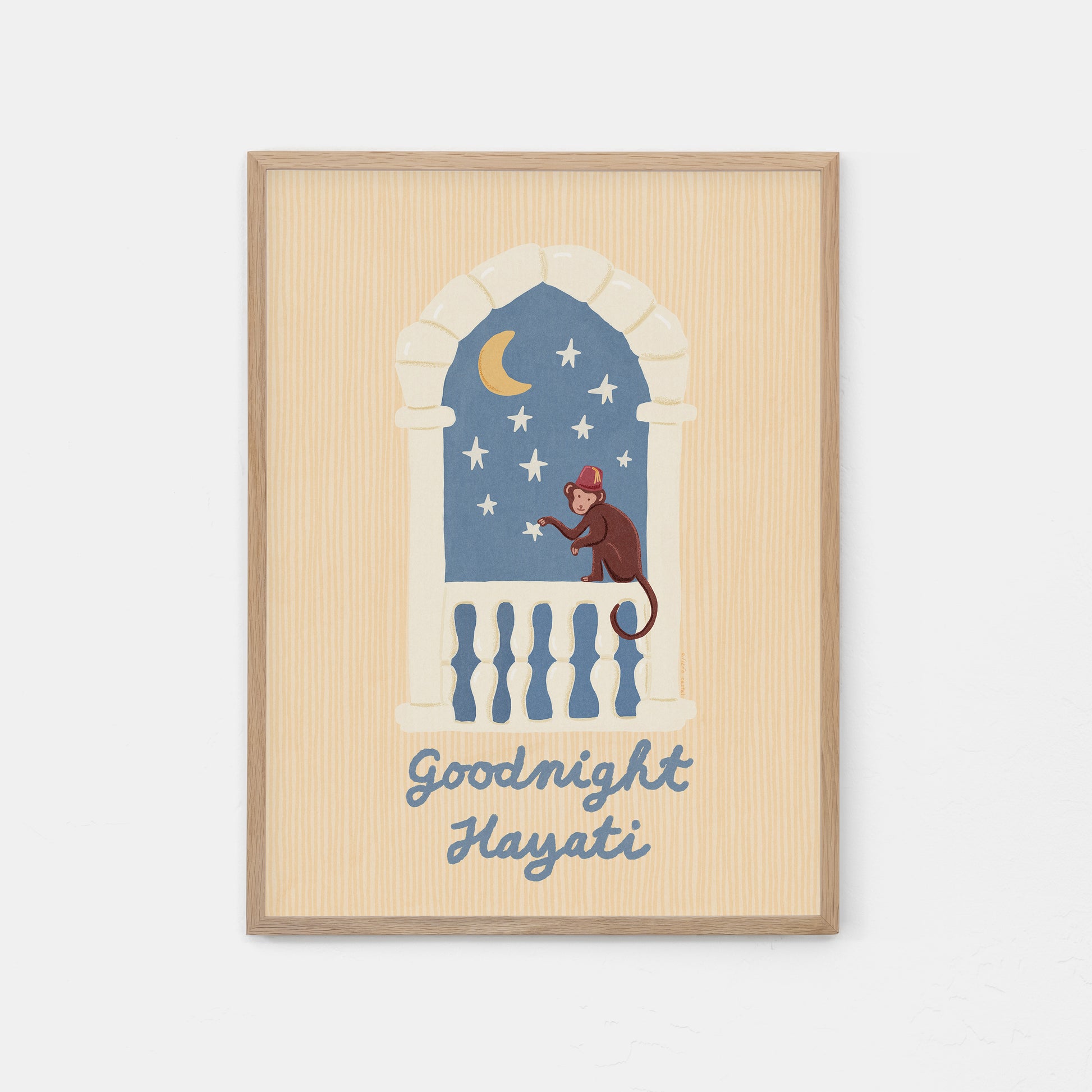 Un singe joueur qui attrape les étoiles sous le ciel nocturne. Parfait pour la chambre de bébé ou le coin lecture, un rappel quotidien de rêver grand.